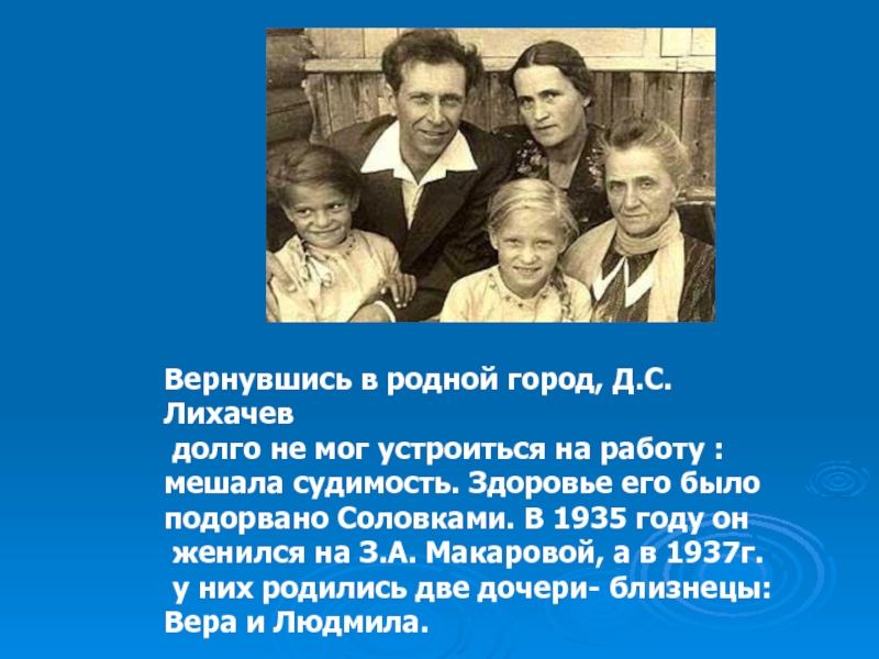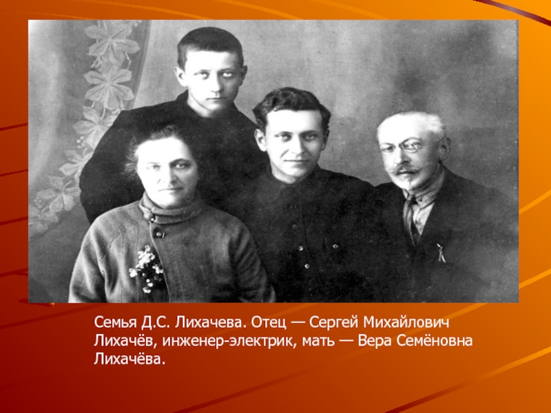 Семья Д.С. Лихачева. Отец — Сергей Михайлович Лихачёв, инженер-электрик, мать — Вера Семёновна Лихачёва.
