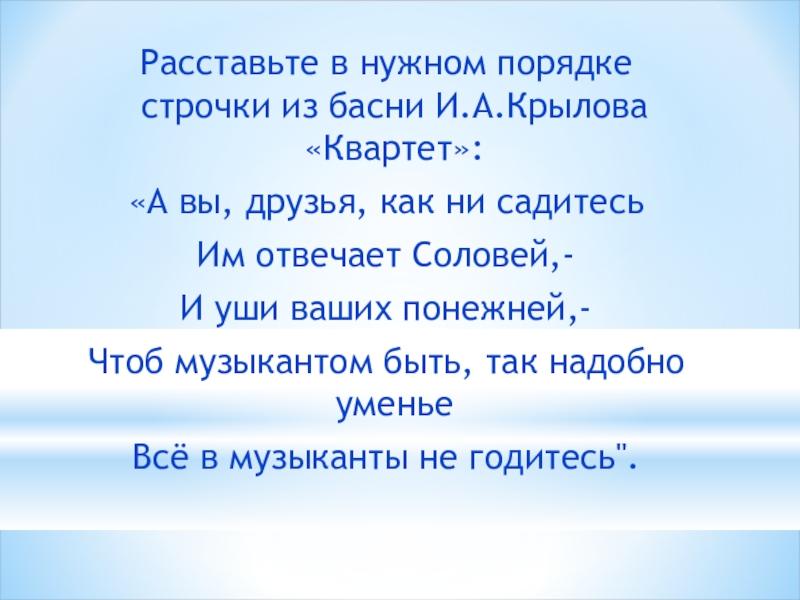 Слайд 31Расставьте в нужном порядке строчки из басни И.А.Крылова «Квартет»: