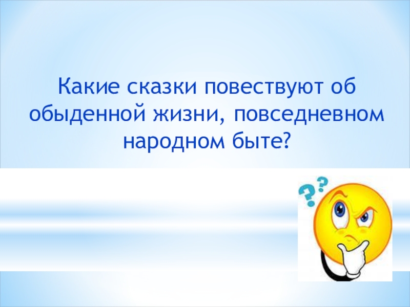 Слайд 5Какие сказки повествуют об обыденной жизни, повседневном народном быте?