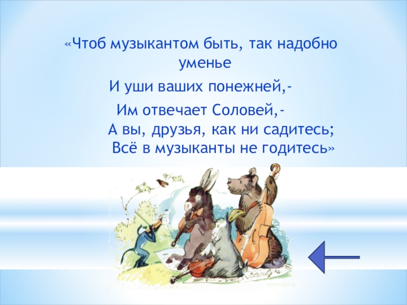 «Чтоб музыкантом быть, так надобно уменьеИ уши ваших понежней,-Им отвечает Соловей,-        А вы, друзья, как ни