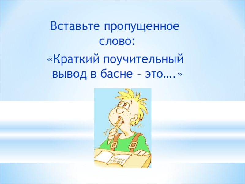 Вставьте пропущенное слово:«Краткий поучительный вывод в басне – это….»