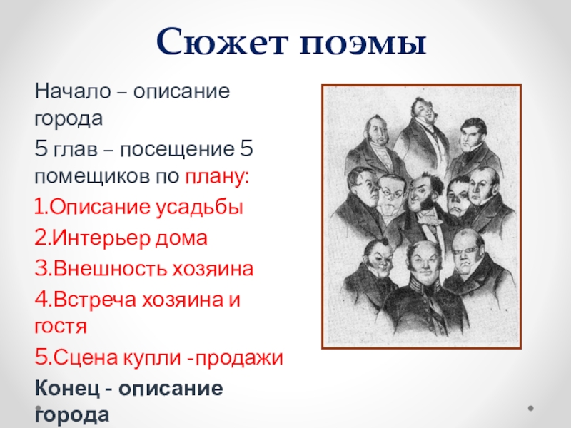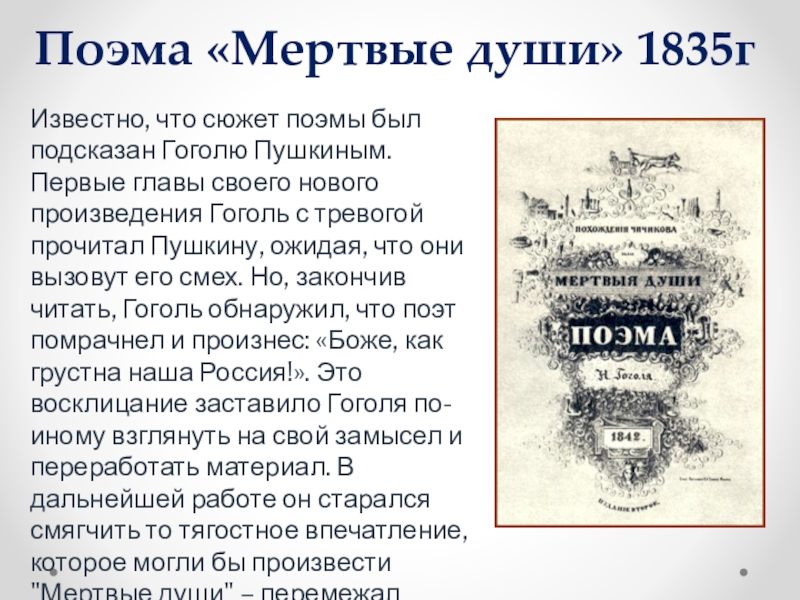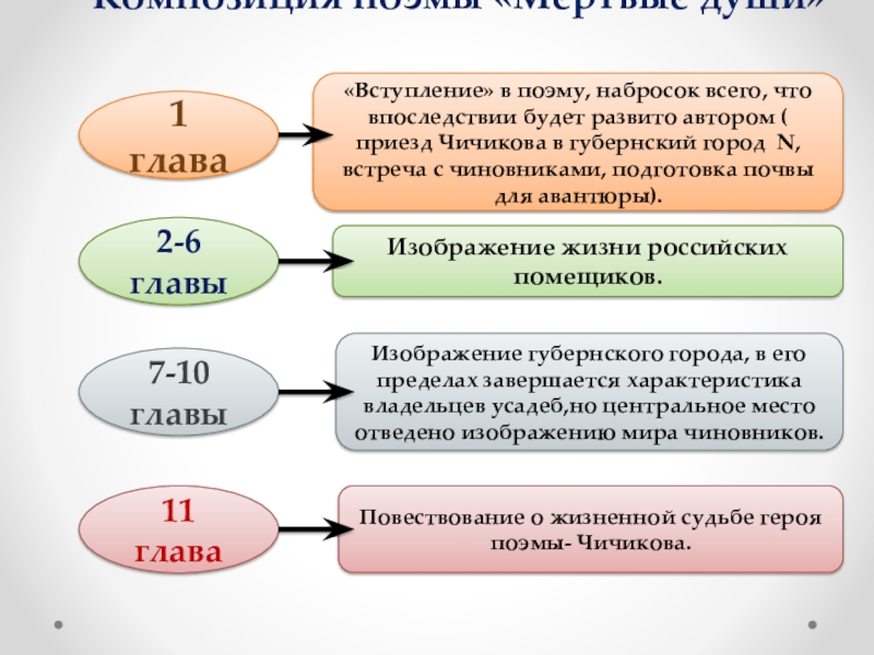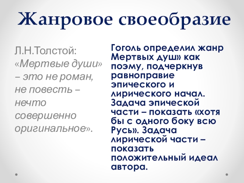 Гоголь определил жанр Мертвых душ» как поэму, подчеркнув равноправие эпического и лирического начал. Задача эпической части – показать «хотя бы с одного боку всю Русь». Задача лирической части – показать положительный идеал автора.