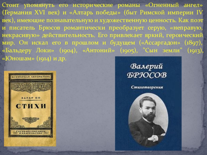 «Алтарь победы» (быт Римской империи IV век), имеющие познавательную и художественную ценность. Как поэт и писатель Брюсов романтически преобразует серую, «неправую, некрасивую» действительность. Его привлекает яркий, героический мир. Он искал его в прошлом и будущем («Ассаргадон» (1897), «Бальдеру Локи» (1904), «Антоний» (1905), "Сын земли" (1913), «Юношам» (1914) и др.