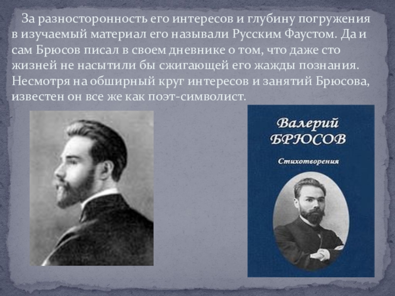 материал его называли Русским Фаустом. Да и сам Брюсов писал в своем дневнике о том, что даже сто жизней не насытили бы сжигающей его жажды познания. Несмотря на обширный круг интересов и занятий Брюсова, известен он все же как поэт-символист.