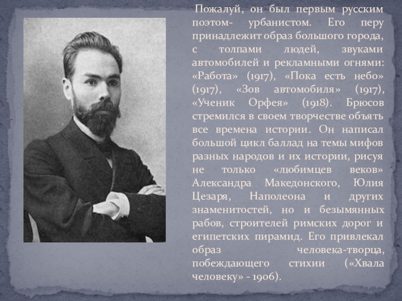 большого города, с толпами людей, звуками автомобилей и рекламными огнями: «Работа» (1917), «Пока есть небо» (1917), «Зов автомобиля» (1917), «Ученик Орфея» (1918). Брюсов стремился в своем творчестве объять все времена истории. Он написал большой цикл баллад на темы мифов разных народов и их истории, рисуя не только «любимцев веков»Александра Македонского, Юлия Цезаря, Наполеона и других знаменитостей, но и безымянных рабов, строителей римских дорог и египетских пирамид. Его привлекал образ человека-творца, побеждающего стихии («Хвала человеку» - 1906).