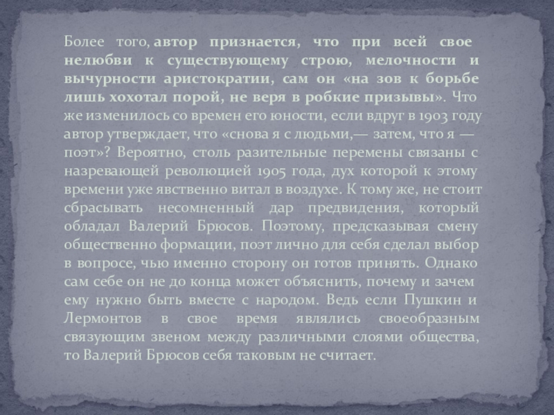мелочности и вычурности аристократии, сам он «на зов к борьбе лишь хохотал порой, не веря в робкие призывы». Что же изменилось со времен его юности, если вдруг в 1903 году автор утверждает, что «снова я с людьми,— затем, что я — поэт»? Вероятно, столь разительные перемены связаны с назревающей революцией 1905 года, дух которой к этому времени уже явственно витал в воздухе. К тому же, не стоит сбрасывать несомненный дар предвидения, который обладал Валерий Брюсов. Поэтому, предсказывая смену общественно формации, поэт лично для себя сделал выбор в вопросе, чью именно сторону он готов принять. Однако сам себе он не до конца может объяснить, почему и зачем ему нужно быть вместе с народом. Ведь если Пушкин и Лермонтов в свое время являлись своеобразным связующим звеном между различными слоями общества, то Валерий Брюсов себя таковым не считает.