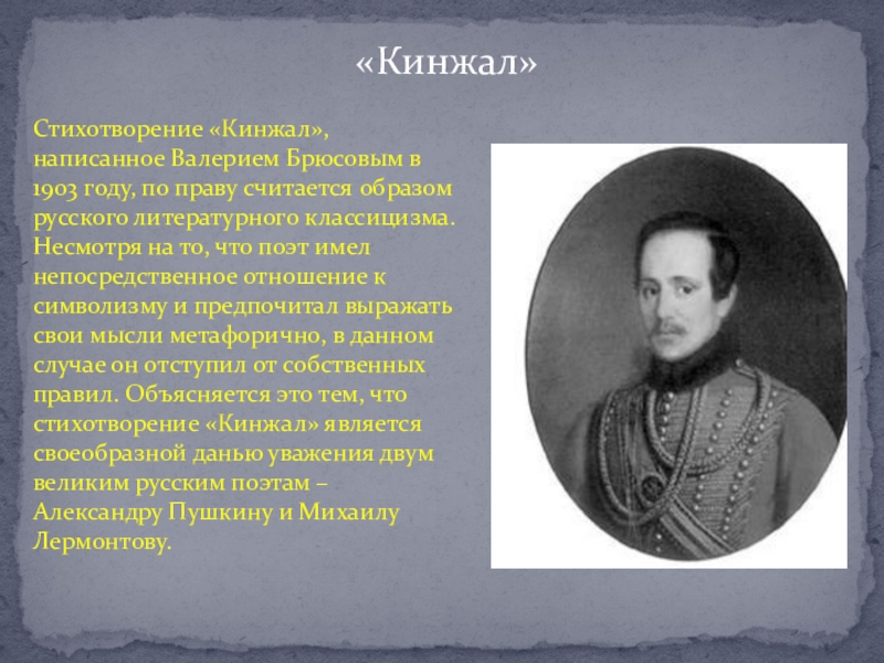 считается образом русского литературного классицизма. Несмотря на то, что поэт имел непосредственное отношение к символизму и предпочитал выражать свои мысли метафорично, в данном случае он отступил от собственных правил. Объясняется это тем, что стихотворение «Кинжал» является своеобразной данью уважения двум великим русским поэтам – Александру Пушкину и Михаилу Лермонтову.