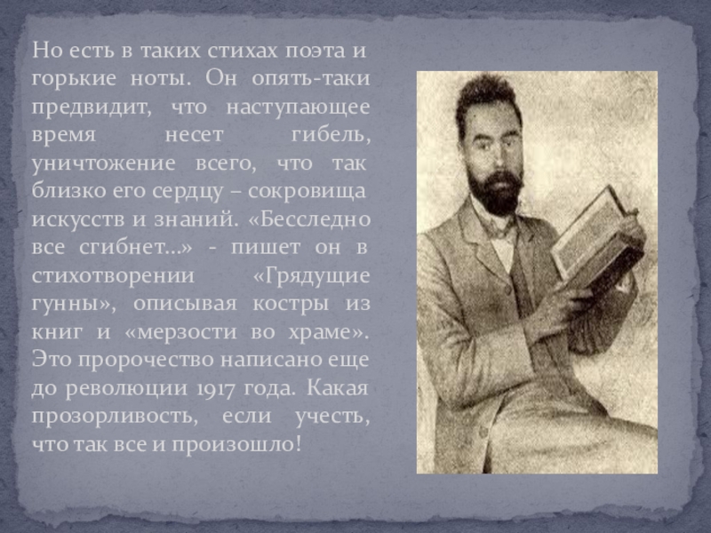 предвидит, что наступающее время несет гибель, уничтожение всего, что так близко его сердцу – сокровища искусств и знаний. «Бесследно все сгибнет…» - пишет он в стихотворении «Грядущие гунны», описывая костры из книг и «мерзости во храме». Это пророчество написано еще до революции 1917 года. Какая прозорливость, если учесть, что так все и произошло!