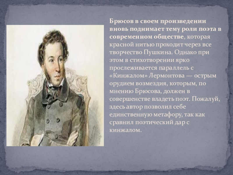 обществе, которая красной нитью проходит через все творчество Пушкина. Однако при этом в стихотворении ярко прослеживается параллель с «Кинжалом» Лермонтова — острым орудием возмездия, которым, по мнению Брюсова, должен в совершенстве владеть поэт. Пожалуй, здесь автор позволил себе единственную метафору, так как сравнил поэтический дар с кинжалом.