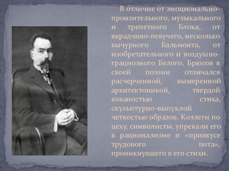 вкрадчиво-певучего, несколько вычурного Бальмонта, от изобретательного и воздушно-грациозного Белого, Брюсов в своей поэзии отличался расчерченной, вымеренной архитектоникой, твердой кованостью стиха, скульптурно-выпуклой четкостью образов. Коллеги по цеху, символисты, упрекали его в рационализме и «привкусе трудового пота», проникнувшего в его стихи.
