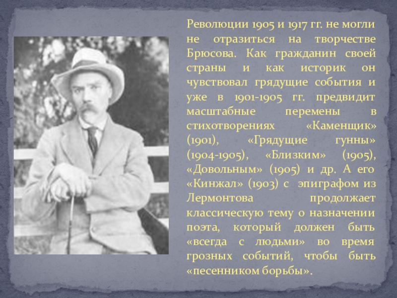 Брюсова. Как гражданин своей страны и как историк он чувствовал грядущие события и уже в 1901-1905 гг. предвидит масштабные перемены в стихотворениях «Каменщик» (1901), «Грядущие гунны» (1904-1905), «Близким» (1905), «Довольным» (1905) и др. А его «Кинжал» (1903) с эпиграфом из Лермонтова продолжает классическую тему о назначении поэта, который должен быть «всегда с людьми» во время грозных событий, чтобы быть «песенником борьбы».