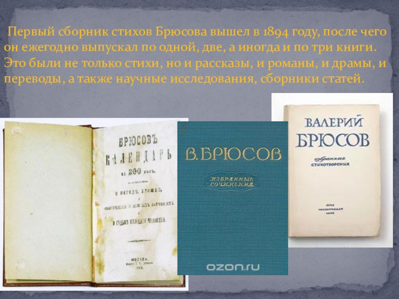 Слайд 6 Первый сборник стихов Брюсова вышел в 1894 году, после чего он