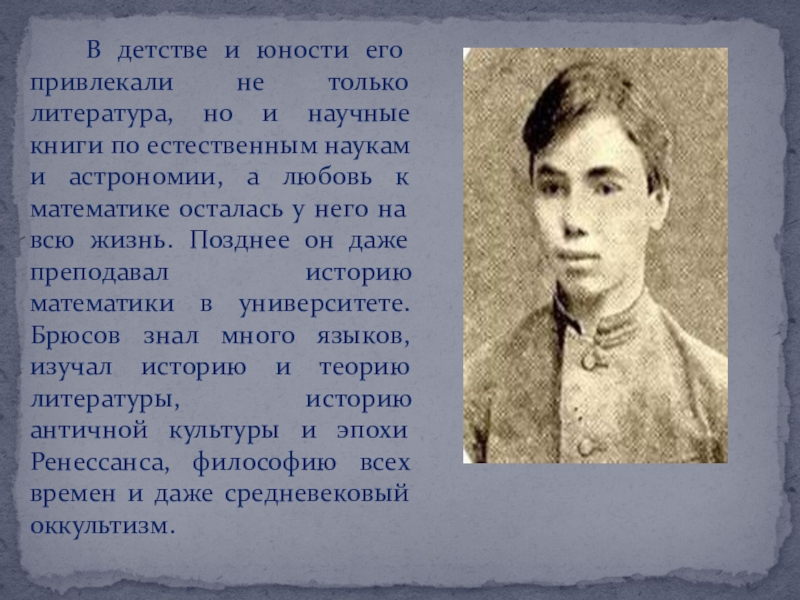 но и научные книги по естественным наукам и астрономии, а любовь к математике осталась у него на всю жизнь. Позднее он даже преподавал историю математики в университете. Брюсов знал много языков, изучал историю и теорию литературы, историю античной культуры и эпохи Ренессанса, философию всех времен и даже средневековый оккультизм.