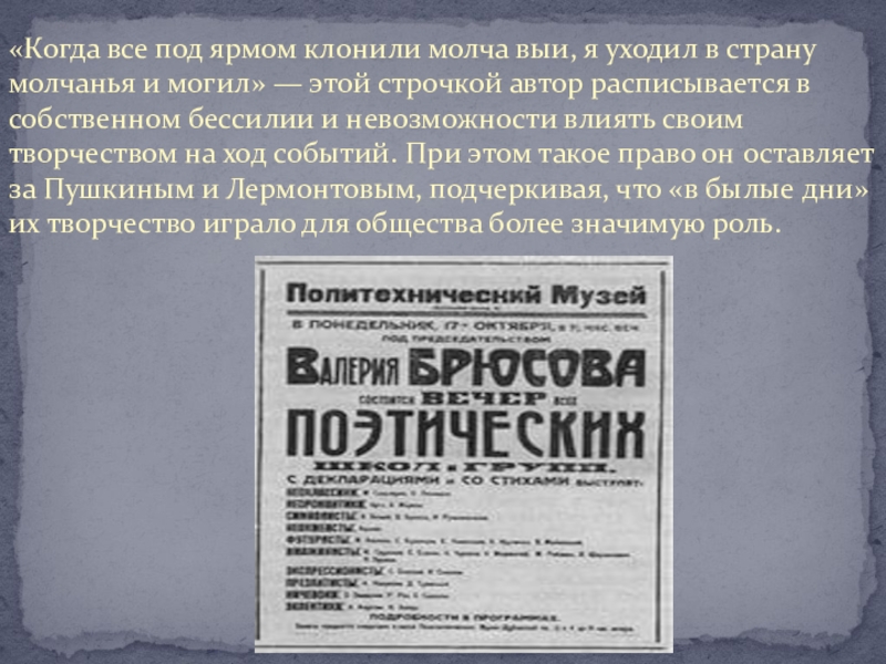 молчанья и могил» — этой строчкой автор расписывается в собственном бессилии и невозможности влиять своим творчеством на ход событий. При этом такое право он оставляет за Пушкиным и Лермонтовым, подчеркивая, что «в былые дни» их творчество играло для общества более значимую роль.