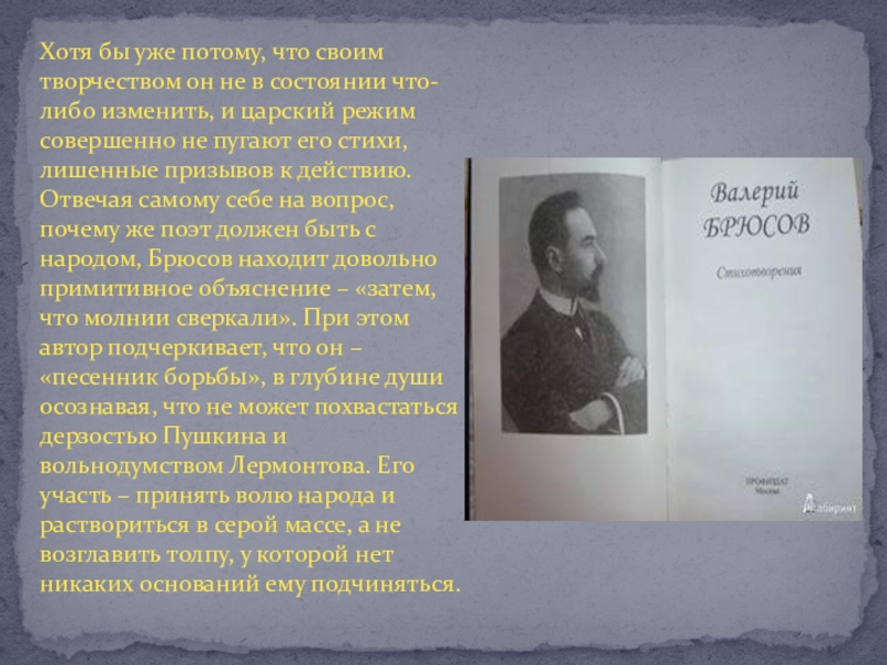 что-либо изменить, и царский режим совершенно не пугают его стихи, лишенные призывов к действию. Отвечая самому себе на вопрос, почему же поэт должен быть с народом, Брюсов находит довольно примитивное объяснение – «затем, что молнии сверкали». При этом автор подчеркивает, что он – «песенник борьбы», в глубине души осознавая, что не может похвастаться дерзостью Пушкина и вольнодумством Лермонтова. Его участь – принять волю народа и раствориться в серой массе, а не возглавить толпу, у которой нет никаких оснований ему подчиняться.
