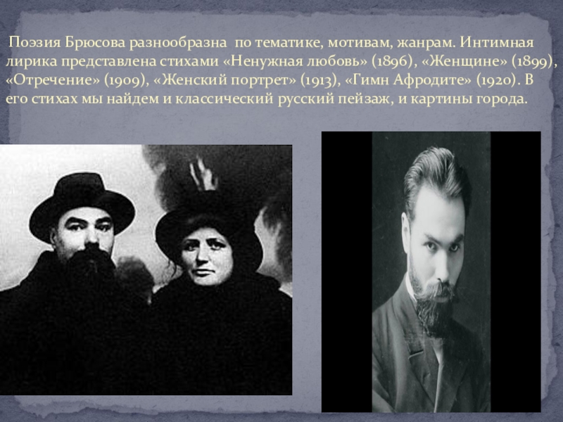Слайд 10 Поэзия Брюсова разнообразна по тематике, мотивам, жанрам. Интимная лирика представлена стихами
