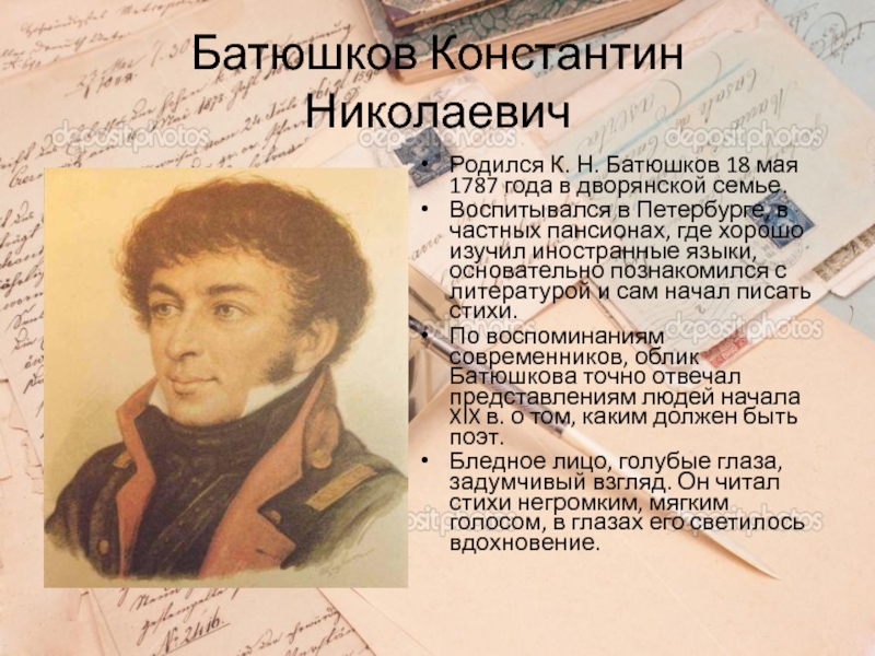По воспоминаниям современников, облик Батюшкова точно отвечал представлениям людей начала XIX в. о том, каким должен быть поэт.