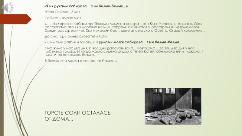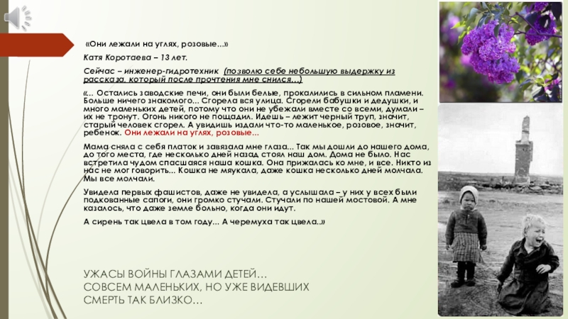 «... Остались заводские печи, они были белые, прокалились в сильном пламени. Больше ничего знакомого... Сгорела вся улица. Сгорели бабушки и дедушки, и много маленьких детей, потому что они не убежали вместе со всеми, думали – их не тронут. Огонь никого не пощадил. Идешь – лежит черный труп, значит, старый человек сгорел. А увидишь издали что-то маленькое, розовое, значит, ребенок. Они лежали на углях, розовые...