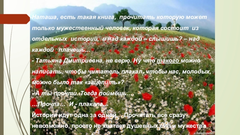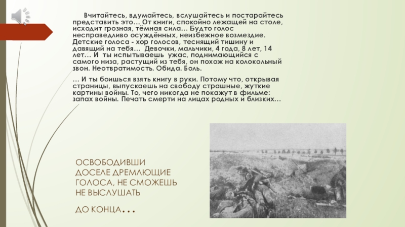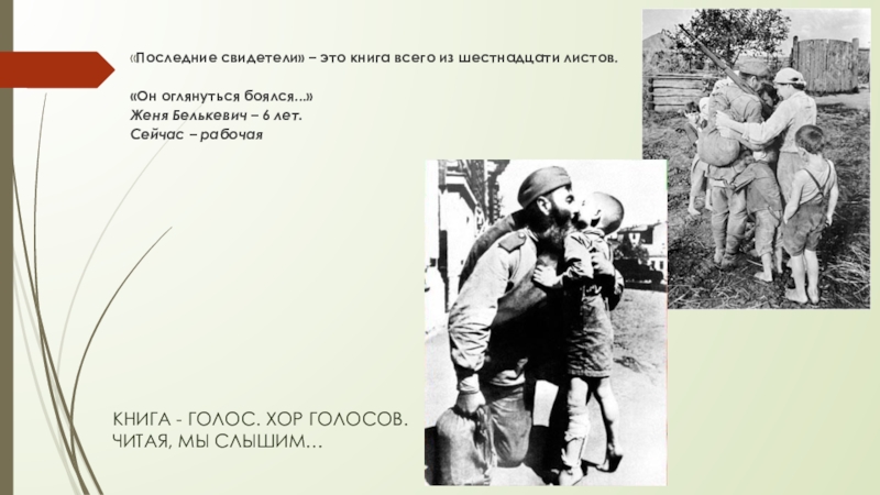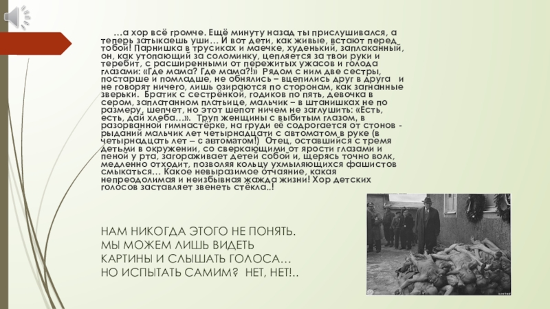 …а хор всё громче. Ещё минуту назад ты прислушивался, а теперь затыкаешь уши… И вот дети, как живые, встают перед тобой! Парнишка в трусиках и маечке, худенький, заплаканный, он, как утопающий за соломинку, цепляется за твои руки и теребит, с расширенными от пережитых ужасов и голода глазами: «Где мама? Где мама?!» Рядом с ним две сестры, постарше и помладше, не обнялись – вцепились друг в друга и не говорят ничего, лишь озираются по сторонам, как загнанные зверьки. Братик с сестрёнкой, годиков по пять, девочка в сером, заплатанном платьице, мальчик – в штанишках не по размеру, шепчет, но этот шепот ничем не заглушить: «Есть, есть, дай хлеба…». Труп женщины с выбитым глазом, в разорванной гимнастёрке, на груди её содрогается от стонов - рыданий мальчик лет четырнадцати с автоматом в руке (в четырнадцать лет – с автоматом!) Отец, оставшийся с тремя детьми в окружении, со сверкающими от ярости глазами и пеной у рта, загораживает детей собой и, щерясь точно волк, медленно отходит, позволяя кольцу ухмыляющихся фашистов смыкаться… Какое невыразимое отчаяние, какая непреодолимая и неизбывная жажда жизни! Хор детских голосов заставляет звенеть стёкла..!