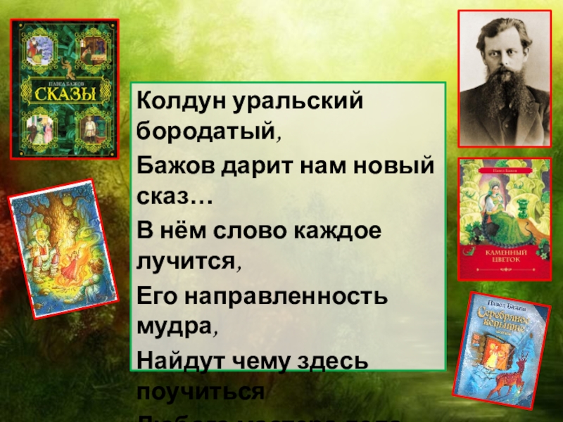 Колдун уральский бородатый,Бажов дарит нам новый сказ…В нём слово каждое лучится,Его направленность мудра,Найдут чему здесь поучитьсяЛюбого мастера