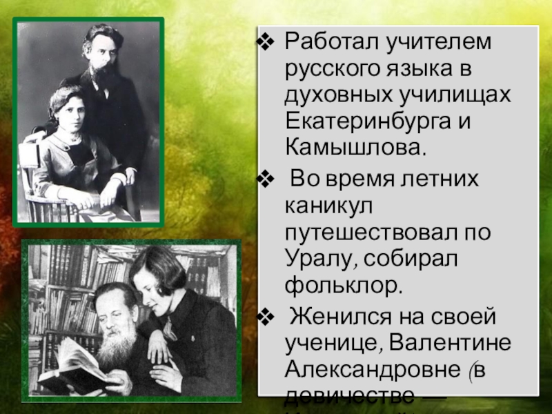 Слайд 4Работал учителем русского языка в духовных училищах Екатеринбурга и Камышлова.
