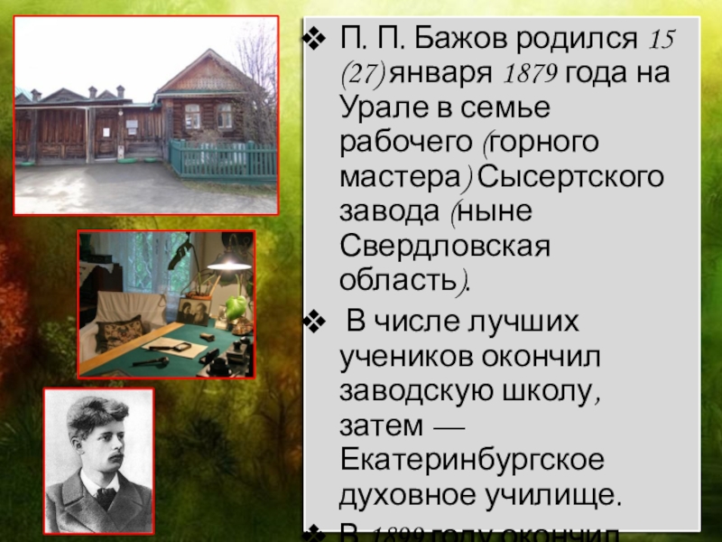 П. П. Бажов родился 15 (27) января 1879 года на Урале в семье рабочего (горного мастера) Сысертского