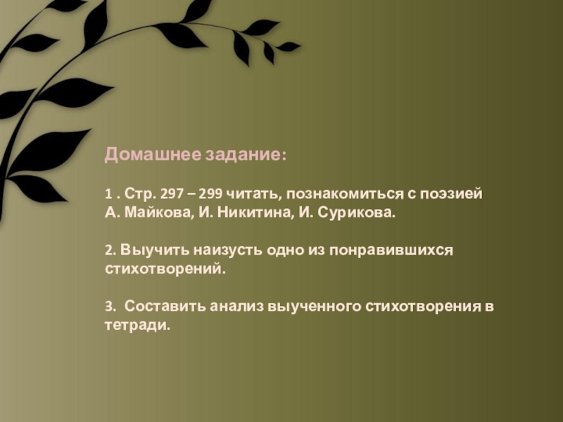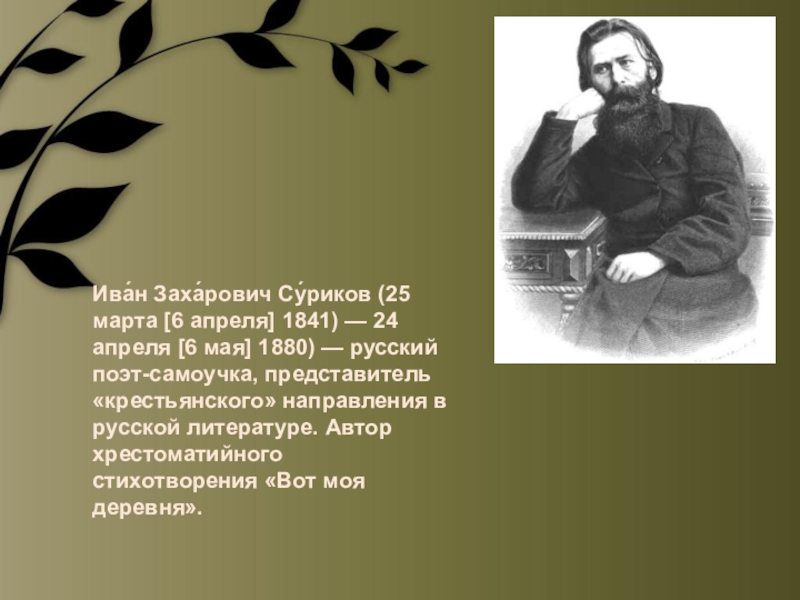 Как наши степи, широка русская натура, оттого-то и чувствуется такая мощь в лучших народных песнях и образцах поэтического творчества Ивана Сурикова. ... Суриков любил поэзию всей душой, она была для него дороже самой жизни.