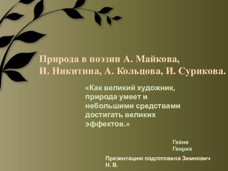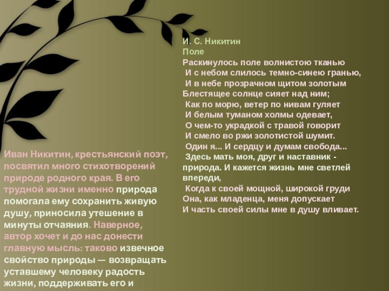 Иван Никитин, крестьянский поэт, посвятил много стихотворений природе родного края. В его трудной жизни именно природа помогала ему сохранить живую душу, приносила утешение в минуты отчаяния. Наверное, автор хочет и до нас донести главную мысль: таково извечное свойство природы — возвращать уставшему человеку радость жизни, поддерживать его и исцелять