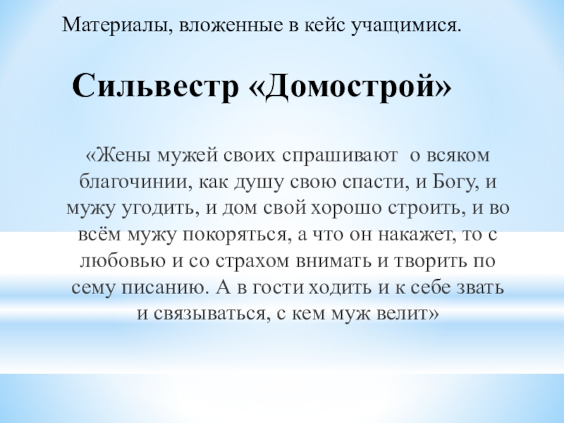 благочинии, как душу свою спасти, и Богу, и мужу угодить, и дом свой хорошо строить, и во всём мужу покоряться, а что он накажет, то с любовью и со страхом внимать и творить по сему писанию. А в гости ходить и к себе звать и связываться, с кем муж велит»