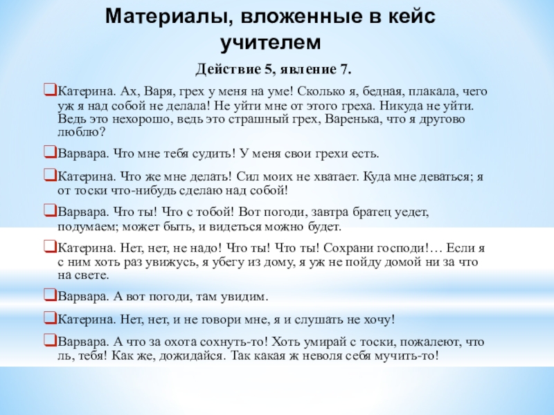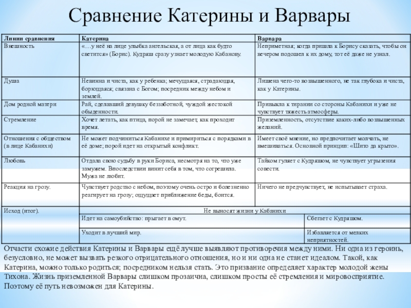 выявляют противоречия между ними. Ни одна из героинь, безусловно, не может вызвать резкого отрицательного отношения, но и ни одна не станет идеалом. Такой, как Катерина, можно только родиться; посредником нельзя стать. Это призвание определяет характер молодой жены Тихона. Жизнь приземленной Варвары слишком прозаична, слишком просты её стремления и мировосприятие. Поэтому её путь невозможен для Катерины.