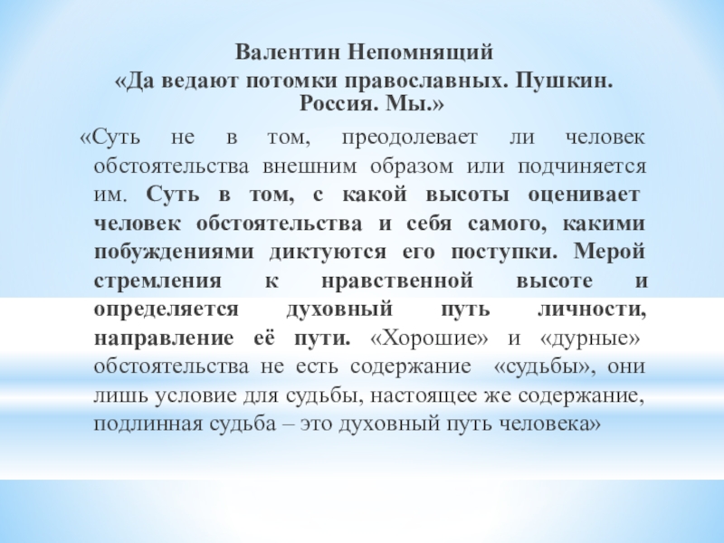 преодолевает ли человек обстоятельства внешним образом или подчиняется им. Суть в том, с какой высоты оценивает человек обстоятельства и себя самого, какими побуждениями диктуются его поступки. Мерой стремления к нравственной высоте и определяется духовный путь личности, направление её пути. «Хорошие» и «дурные» обстоятельства не есть содержание «судьбы», они лишь условие для судьбы, настоящее же содержание, подлинная судьба – это духовный путь человека»