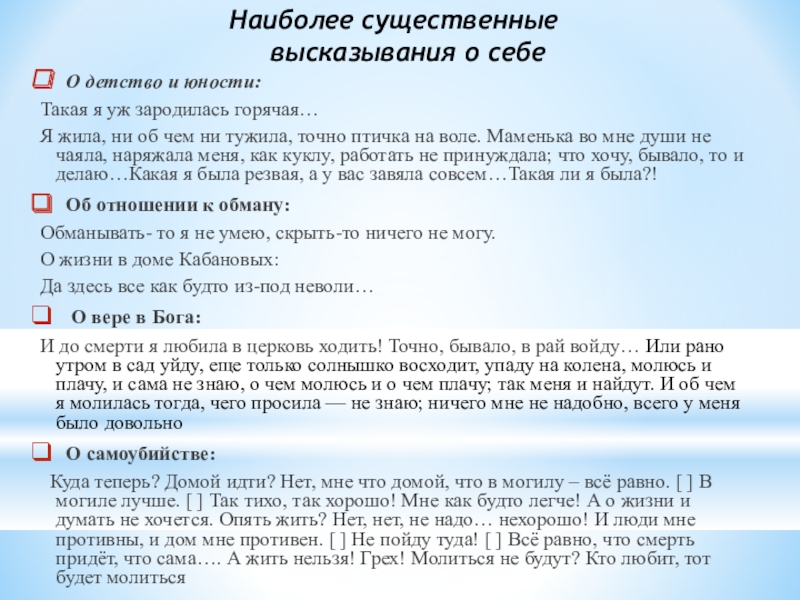 над собой, очистить свой мозг от разного мусора, сделаться полным хозяином своего внутреннего мира, обогатить этот мир кое-какими знаниями и идеями. И, наконец, изучивши самого себя, найти себе в жизни разумную, полезную и приятную деятельность». Катерине чужда «самостоятельная умственная деятельность», она не может быть «лучом света в тёмном царстве». Катерина «совершив множество глупостей, бросается в воду и делает таким образом последнюю и величайшую нелепость»