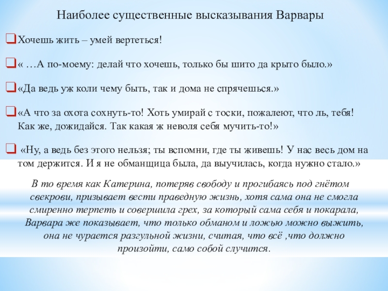 В то время как Катерина, потеряв свободу и прогибаясь под гнётом свекрови, призывает вести праведную жизнь, хотя сама она не смогла смиренно терпеть и совершила грех, за который сама себя и покарала, Варвара же показывает, что только обманом и ложью можно выжить, она не чурается разгульной жизни, считая, что всё ,что должно произойти, само собой случится.