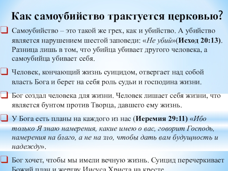 убийство. А убийство является нарушением шестой заповеди: «Не убий»(Исход 20:13). Разница лишь в том, что убийца убивает другого человека, а самоубийца убивает себя.