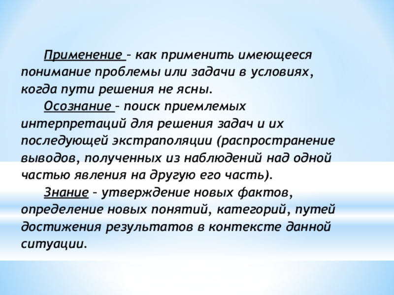 Слайд 6Применение – как применить имеющееся понимание проблемы или задачи в условиях,