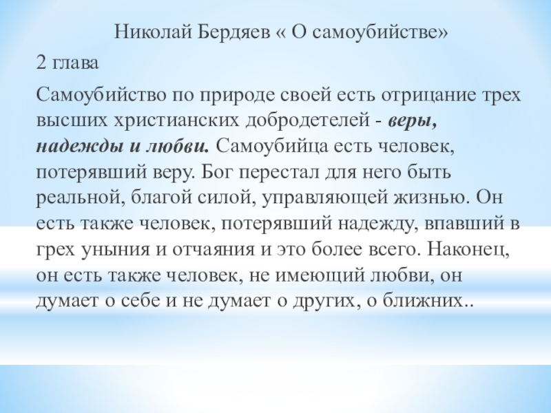 трех высших христианских добродетелей - веры, надежды и любви. Самоубийца есть человек, потерявший веру. Бог перестал для него быть реальной, благой силой, управляющей жизнью. Он есть также человек, потерявший надежду, впавший в грех уныния и отчаяния и это более всего. Наконец, он есть также человек, не имеющий любви, он думает о себе и не думает о других, о ближних..