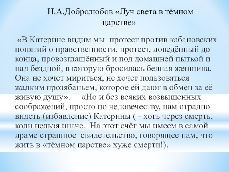 протест против кабановских понятий о нравственности, протест, доведённый до конца, провозглашённый и под домашней пыткой и над бездной, в которую бросилась бедная женщина. Она не хочет мириться, не хочет пользоваться жалким прозябаньем, которое ей дают в обмен за её живую душу». «Но и без всяких возвышенных соображений, просто по человечеству, нам отрадно видеть (избавление) Катерины ( - хоть через смерть, коли нельзя иначе. На этот счёт мы имеем в самой драме страшное свидетельство, говорящее нам, что жить в «тёмном царстве» хуже смерти!).