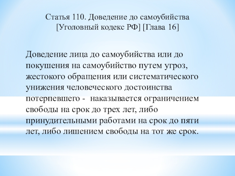 до самоубийства или до покушения на самоубийство путем угроз, жестокого обращения или систематического унижения человеческого достоинства потерпевшего - наказывается ограничением свободы на срок до трех лет, либо принудительными работами на срок до пяти лет, либо лишением свободы на тот же срок.
