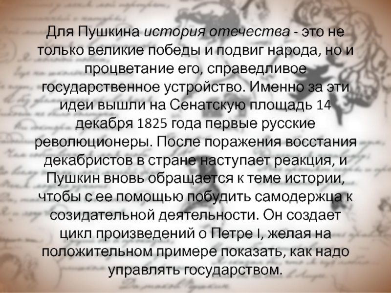 подвиг народа, но и процветание его, справедливое государственное устройство. Именно за эти идеи вышли на Сенатскую площадь 14 декабря 1825 года первые русские революционеры. После поражения восстания декабристов в стране наступает реакция, и Пушкин вновь обращается к теме истории, чтобы с ее помощью побудить самодержца к созидательной деятельности. Он создает цикл произведений о Петре I, желая на положительном примере показать, как надо управлять государством.