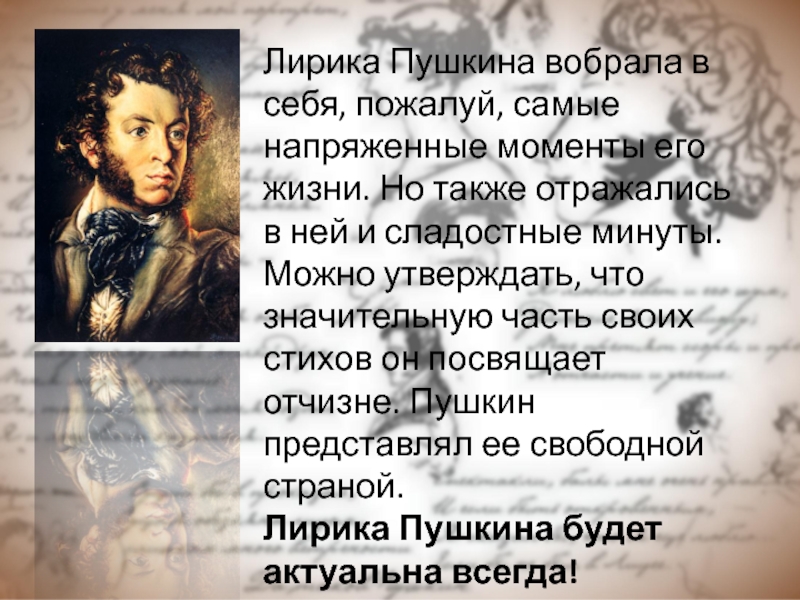 Слайд 9Лирика Пушкина вобрала в себя, пожалуй, самые напряженные моменты его жизни.