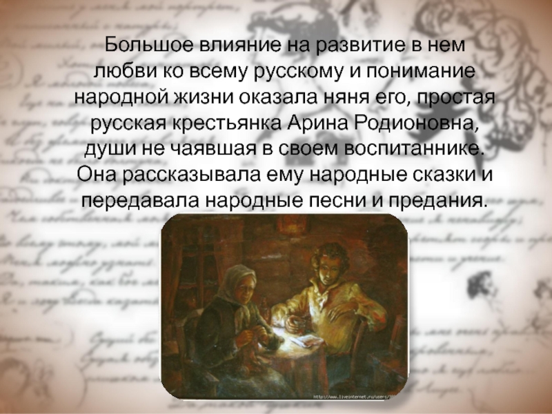 понимание народной жизни оказала няня его, простая русская крестьянка Арина Родионовна, души не чаявшая в своем воспитаннике. Она рассказывала ему народные сказки и передавала народные песни и предания.