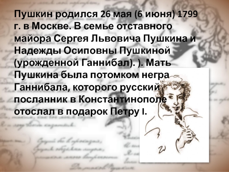 семье отставного майора Сергея Львовича Пушкина и Надежды Осиповны Пушкиной (урожденной Ганнибал). ). Мать Пушкина была потомком негра Ганнибала, которого русский посланник в Константинополе отослал в подарок Петру I.