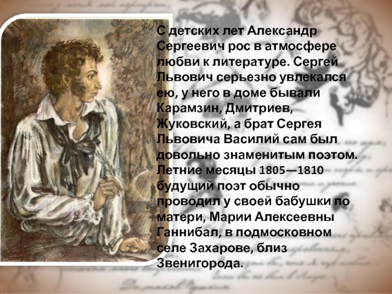 Слайд 5С детских лет Александр Сергеевич рос в атмосфере любви к литературе.