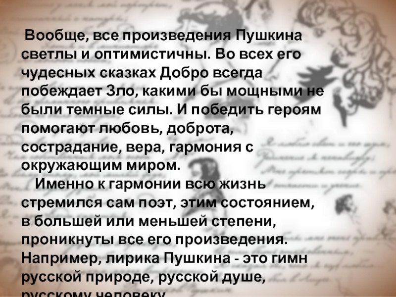 Слайд 19 Вообще, все произведения Пушкина светлы и оптимистичны. Во всех его чудесных