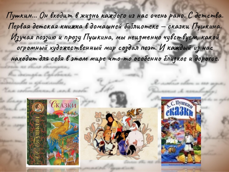 Слайд 2Пушкин... Он входит в жизнь каждого из нас очень рано. С
