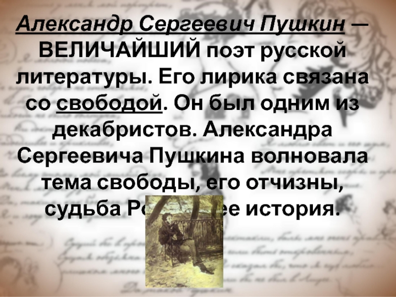 со свободой. Он был одним из декабристов. Александра Сергеевича Пушкина волновала тема свободы, его отчизны, судьба России, ее история.