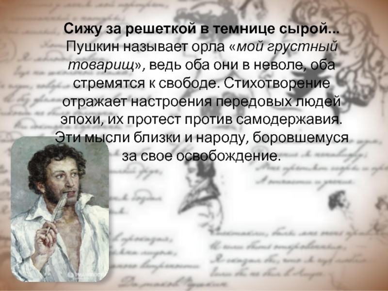 ведь оба они в неволе, оба стремятся к свободе. Стихотворение отражает настроения передовых людей эпохи, их протест против самодержавия. Эти мысли близки и народу, боровшемуся за свое освобождение.