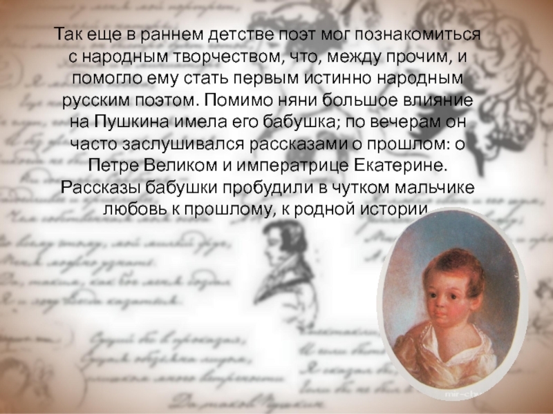 что, между прочим, и помогло ему стать первым истинно народным русским поэтом. Помимо няни большое влияние на Пушкина имела его бабушка; по вечерам он часто заслушивался рассказами о прошлом: о Петре Великом и императрице Екатерине. Рассказы бабушки пробудили в чутком мальчике любовь к прошлому, к родной истории.