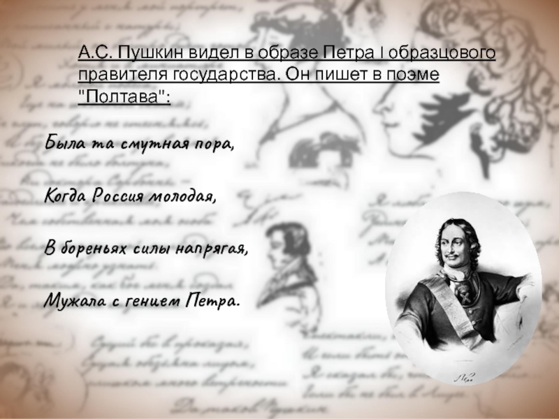 Слайд 15А.С. Пушкин видел в образе Петра I образцового правителя государства. Он
