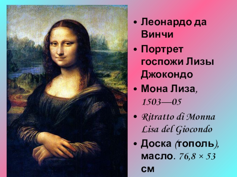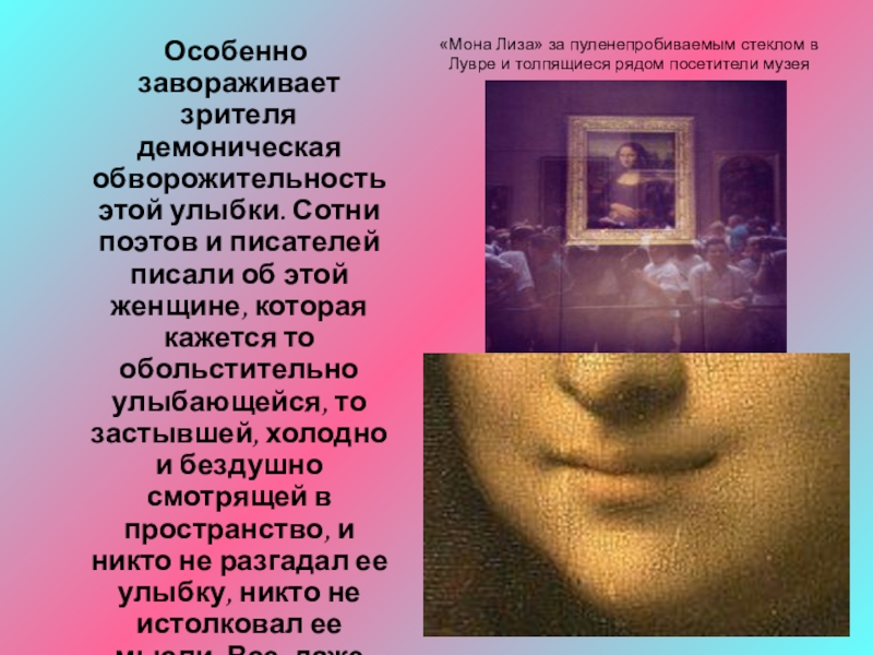 Особенно завораживает зрителя демоническая обворожительность этой улыбки. Сотни поэтов и писателей писали об этой женщине, которая кажется то обольстительно улыбающейся, то застывшей, холодно и бездушно смотрящей в пространство, и никто не разгадал ее улыбку, никто не истолковал ее мысли. Все, даже пейзаж, таинственны, подобно сновидению, трепетны, как предгрозовое марево чувственности (Мутер)